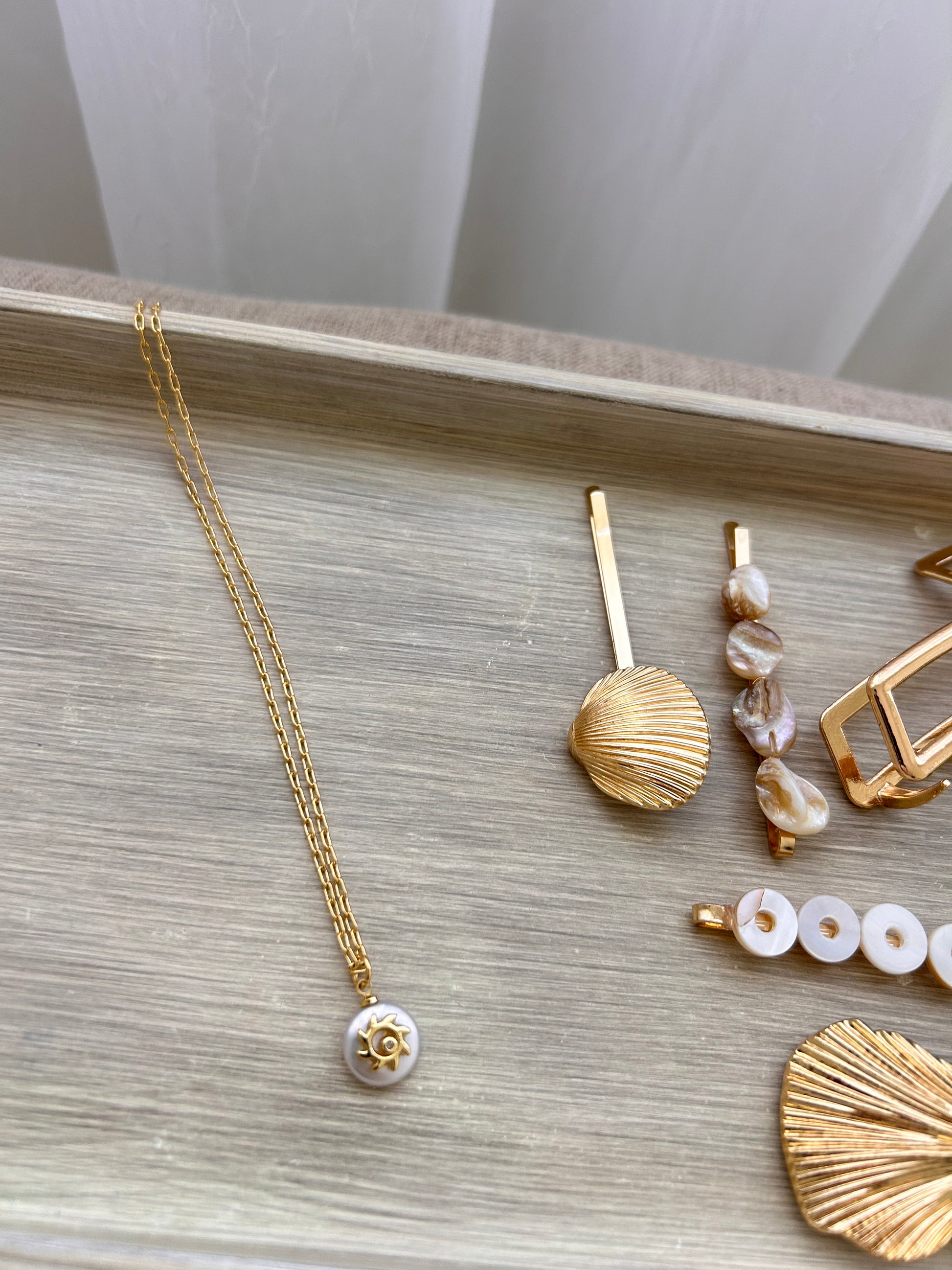 The Solar Pearl Necklace features a delicate freshwater-style pearl charm engraved with a radiant sun, symbolizing light, warmth, and clarity. Paired with a fine 18K gold-plated paperclip chain, it’s a subtle yet powerful accessory inspired by the calm elegance of the Mediterranean coast.
