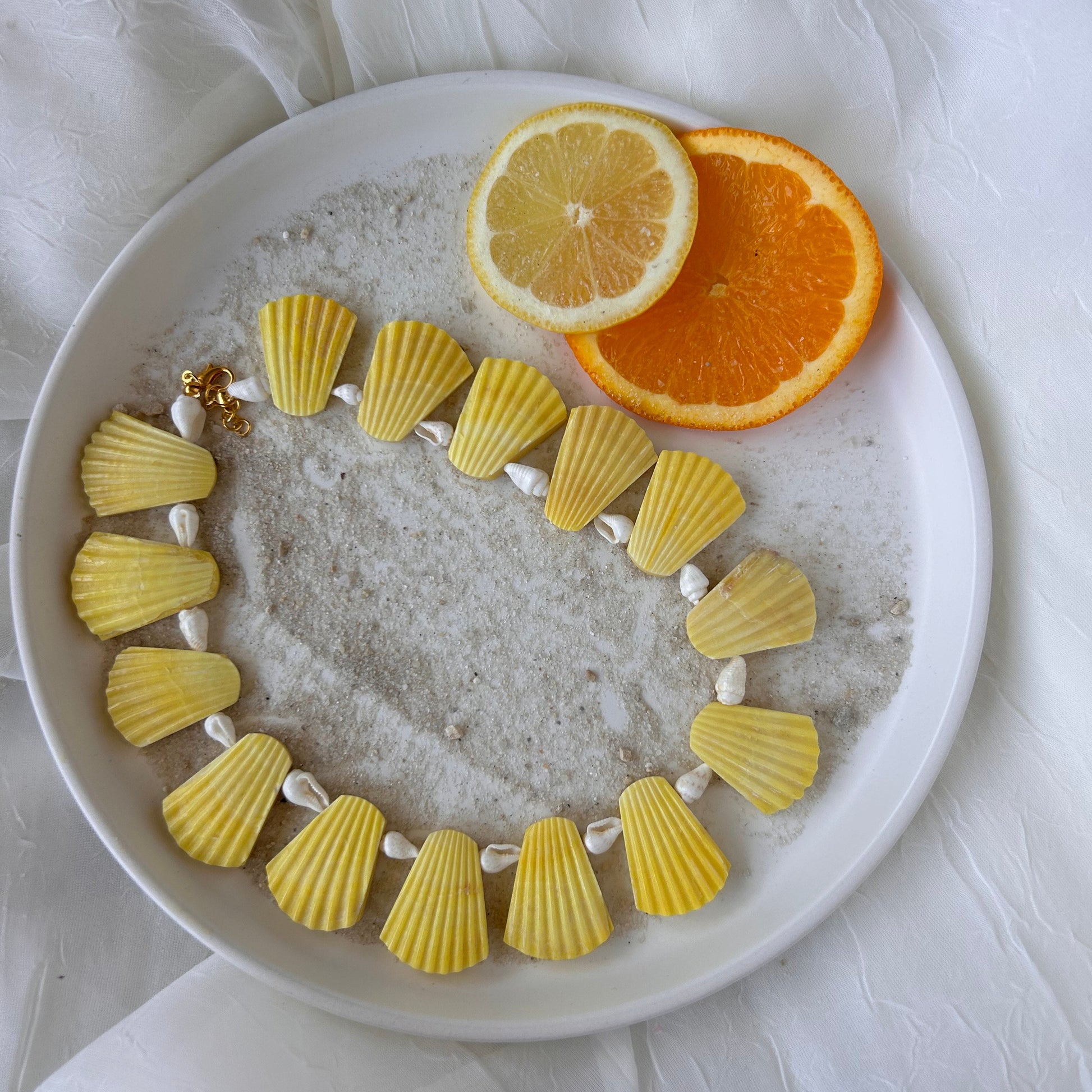 Handcrafted with vivid yellow natural shells and knotted with delicate white cowrie accents, this piece captures the warmth, light, and bold beauty of Caribbean beaches.