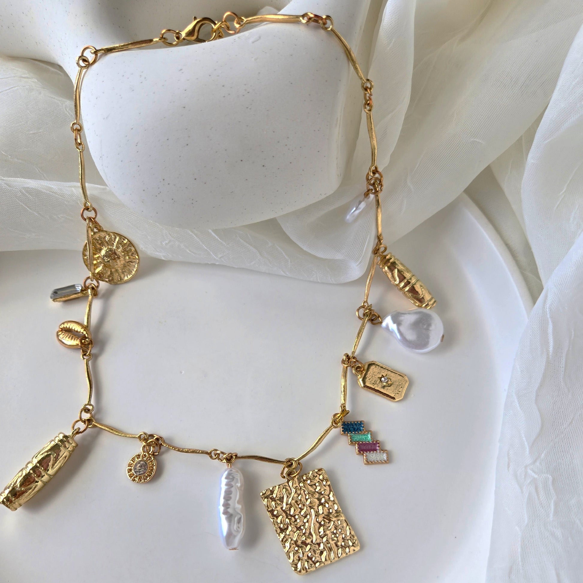 Eclectic and radiant, the Treasure Coast Necklace is a celebration of sun, sea, and hidden gems. Crafted with a delicate gold stainless steel chain and adorned with a playful mix of textured charms — including organic pearls, sun medallions, mosaic enamel tiles, and raw gold details — this piece tells a story of adventure and discovery.